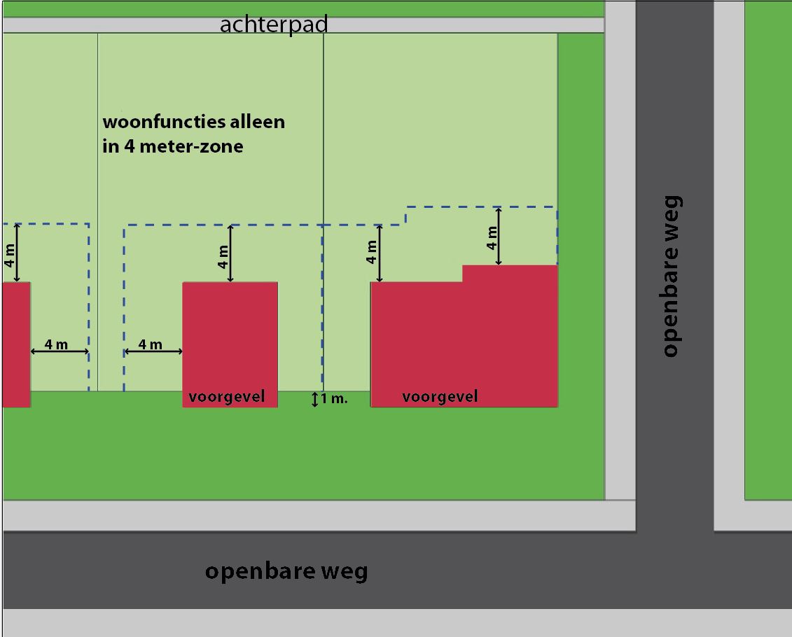 - De zone van 4 meter volgt met een off-set de gevel van het hoofdgebouw